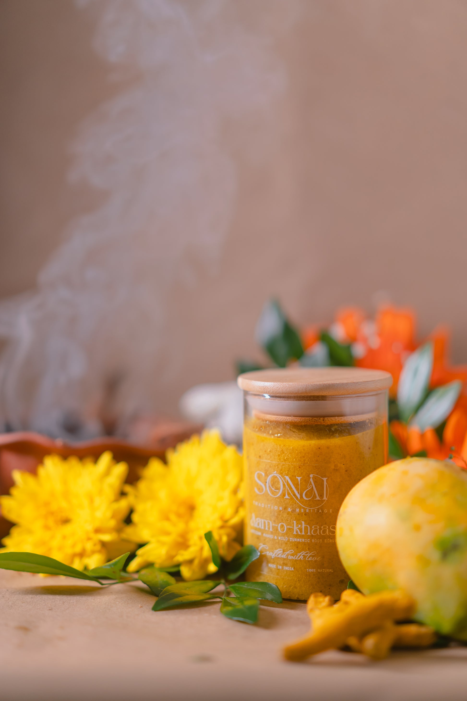Aam-O-Khaas is summer bottled — a lush, golden escape that glows with every touch. Handcrafted in slow, thoughtful batches, this vibrant scrub draws from ancient Ayurvedic rituals and the wisdom of Indian herbology to bring your skin back to life.